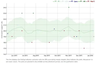 Two new polls were hailed as good news for Fianna F?il this weekend. A Red C poll put the party up 2 points to 19 per cent, while B&A put the party up 1 point to 20 per cent. In fact, neither change is statistically significant on its own - with the December poll of Red C seemingly an ‘outlier’ on the low side (see below). Even if we combine all of the polls, as the Irish Polling Indicator does, we find no change in support: Fianna Fáil remains stable at 20 per cent. Support for Micheál Martin’s party has not been statistically significantly different from current levels since May 2014.