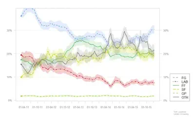 Sinn Féin is now at about 19% support. This is a clear improvement on its last General Election result, but the party has polled higher between May 2014 and March 2015. The current level of support is comparable to what Sinn Féin has scored in most of the current parliamentary term. The Green Party is another beacon of stability, albeit at the much lower level of about 2%.