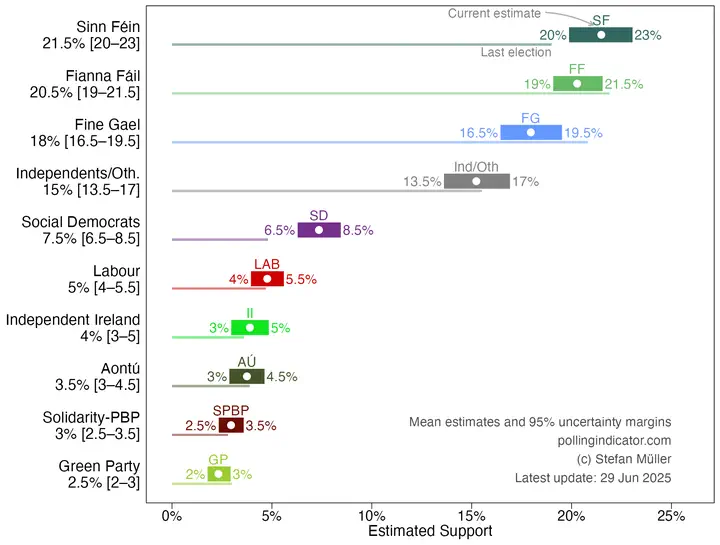 According to the Irish Polling Indicator, Sinn Féin remains the leading party with 21.5% [95% uncertainty margins: 20–23], slightly ahead of Fianna Fáil on 20.5% [19–21.5]. Fine Gael follows at 18% [16.5–19.5]. Independents and Other Parties not listed below poll at 15% [13.5–17].